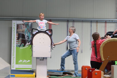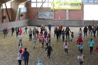 Auf einem weiteren Hof wurden blind Figuren wie zum Beispiel ein Dreieck, eine Schlangenlinie oder das Haus vom Nikolaus mit einer Longe geformt. Außerdem gab es einen Wassertransport mit Schwämmen durch einen Parcours und ein Pferde Quiz.