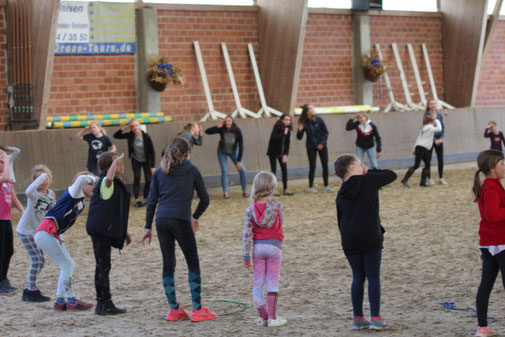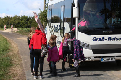 Am Sonntag begann der Tag wieder mit gemeinsamen Spielen in der Reithalle. Danach ging es in den Gruppen zu verschiedenen Höfen in der Umgebung. Zum ersten Mal gab es einen Bus beim Sommercamp, der die Kinder nach Schnathorst brachte, wo der Movie des Vereins steht. Ein Movie ist ein elektrisch betriebenes galoppierendes Holzpferd, welches beim Voltigieren ein wichtiges Übungsgerät ist. Hier konnten die Kinder spielerisch erfahren, wie sich der Galopp auf einem Pferd anfühlen kann. Sie versuchten im Sitzen oder auch im Stehen von dem Movie aus Sandsäcke in Hula Hoop Reifen zu werfen. Der Bus-Shuttle wurde durch die Unterstützung von "Graß-Reisen aus Hüllhorst ermöglicht.